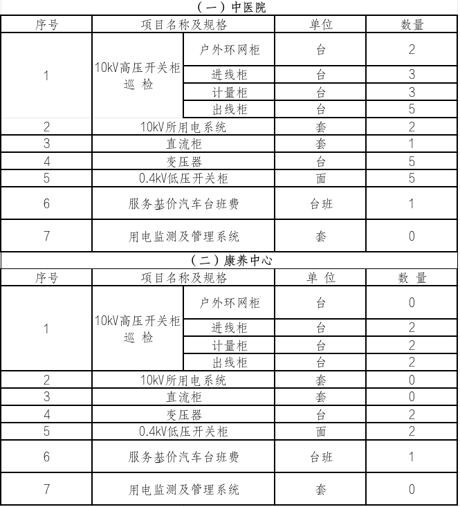 我单位拟对配电设备运维项目进行公开市场调研,欢迎符合资格条件的供应商报名参加。本次调研旨在了解市场价格、服务方案及供应能力,不作为最终采购承诺。 1.项目名称:配电设备运维 2.主要服务内容:对中医院及康养中心的配电设备进行定期维护、日常维护及特殊维护,运维清单详见附件。 3.质量需求: (1)设备全年安全运行率≥99.9%。 (2)故障响应及时率 100%; (3)电能质量、接地电阻等关键指标 100% 符合国标要求; (4)建立全生命周期设备台账,实现运维可追溯、风险可预判。 (5)维保服务执行需符合电力行业相关电力设备检修、维修导则等标准。 二、供应商资格要求 (1)具备《承装(修、试)电力设施许可证》(承装类、承修类、承试类均为三级及以上)及《安全生产许可证》; (2)近三年在经营活动中无重大违法记录; 三、调研响应文件内容(加盖公章) (1)营业执照复印件; (2)资质证书复印件; (3)报价单(格式自拟,含年度运维总价); (4)2023年1月1日至今同类项目业绩(附合同关键页); 递交方式及截止时间 1. 递交方式:请将响应文件电子版(PDF扫描件)发送至邮箱:laqzyycgb@126.com,邮件标题格式为“配电设备运维调研+公司全称”。2. 报名截止时间:2026年3月23日17:00(以邮箱收到时间为准),调研时间另行通知。 3.联系人:高老师、陈老师 联系电话:0571-61072927 临安区中医院采供部 2026年3月20日 附件:配电设备清单